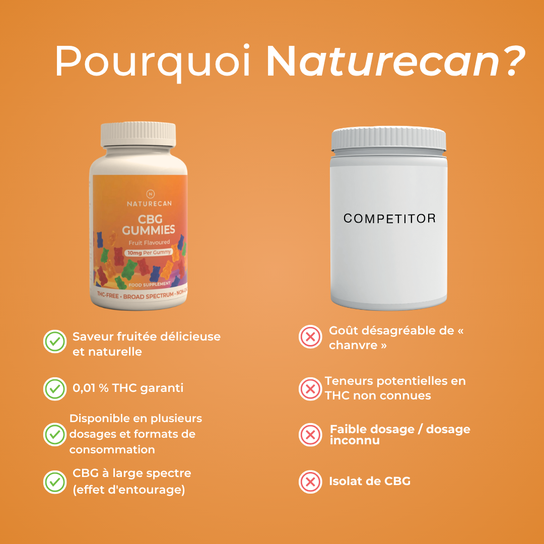 Naturecan s'engage à proposer des produits CBD et CBG haut de gamme, scientifiquement éprouvés et fabriqués avec soin. Nous n'utilisons jamais d'isolats ni de matières synthétiques, mais uniquement des extraits naturels à base de plantes. Présents dans plus de 40 pays, notre mission est de rendre les cannabinoïdes de haute qualité accessibles à tous à travers le monde, grâce à des tests effectués par des tiers, des pratiques durables et une transparence totale de la chaîne d'approvisionnement.