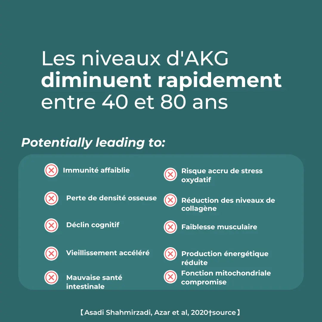 Les niveaux d'alpha-cétoglutarate (AKG) diminuent naturellement avec l'âge. Cette réduction a été associée à des changements dans le métabolisme énergétique et le fonctionnement cellulaire global. En prenant des compléments alimentaires à base d'alpha-cétoglutarate de calcium (Ca-AKG), vous donnez à votre corps un coup de pouce proactif pour aider à soutenir la vitalité cellulaire et un vieillissement en bonne santé.